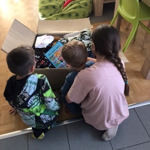 Nous envoyons des colis de vêtements et distribuons des fournitures scolaires aux enfants.
